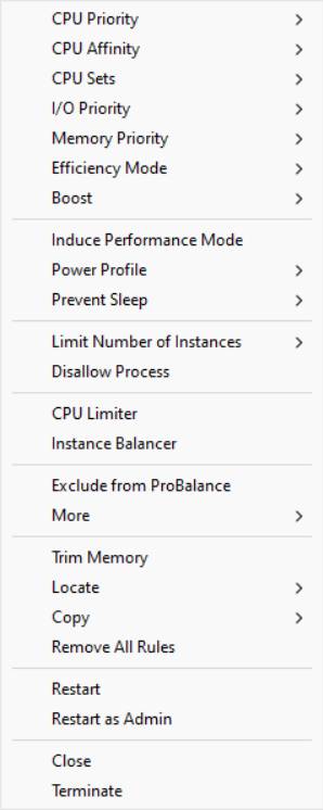 The Process List shows running processes and allows for easy rule creation. You can right click on any process, or on multiple processes, to get a context menu of available options. Among many other things, the options include setting current priorities and affinities, as well as default priorities and affinities.